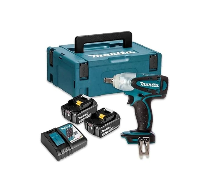 2.The impact wrench also includes two 3.0Ah Li-ion batteries, a charger and a Makita MAKPAC carrying case. The included batteries offer increased runtime and are compatible with all Makita 18V Li-ion tools. The charger is compatible with all Makita 18V Li-ion batteries and charges quickly and safely. The Makita MAKPAC case provides convenient storage and transport for the impact wrench and its accessories.